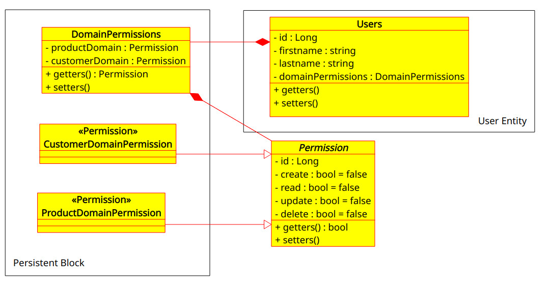 And this “DomainPermission” class has 2 “Permission” super type attributes for available application domain types. Also, has OneToOne Unidirectinal association with “Permission” super type. In future when a new domain comes I can simply create another subtype and add another attribute in here such as:
